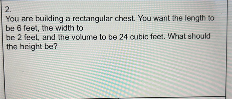2. You are building a rectangular chest. You want the length to be 6 feet, the width to be 2 feet, and the volume to be 24 cubic feet. What should the height be?