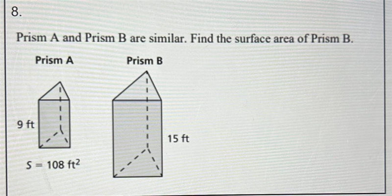 8. Prism A and Prism B are similar. Find the surface area of Prism B. Prism A Prism B 9 ft S=108 ft² 15 ft