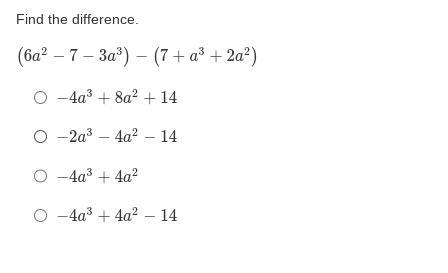 Thus, the difference of (6a^2 − 7− 3a^3) − (7 + a^3 + 2a^2) is 4a^2 - 4a^3 - 14