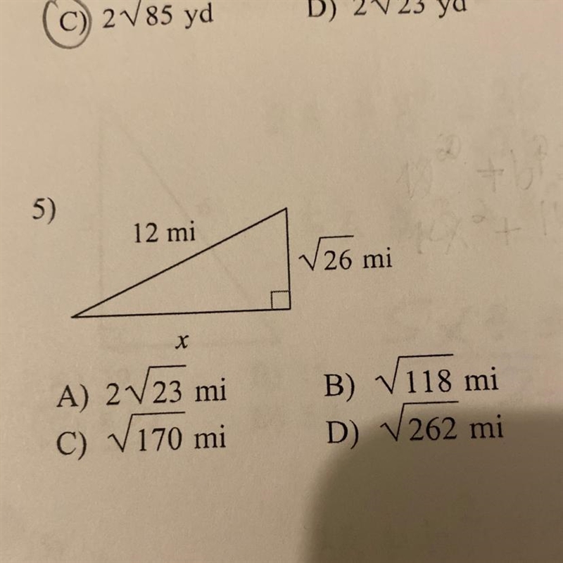 - In the figure, the sides measuring x mi and √26 mi are the legs, so we plug these in for a and b in the theorem,