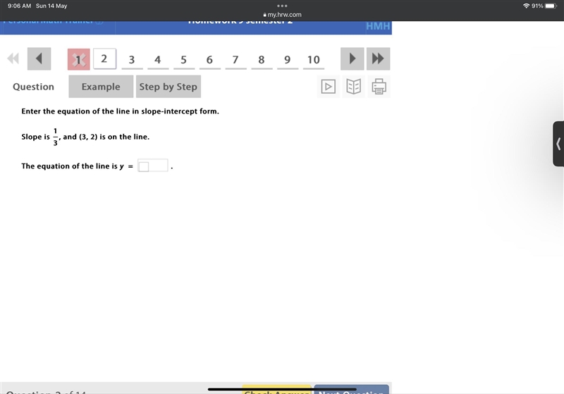 Due to the answer requesting slope intercept form, one shall use the points (3,2) in order to substitute for b. Slope intercept form is formatted in y = mx + b, which m would be your slope, which in this particular problem was given; therefore, y = 1/3x +b.