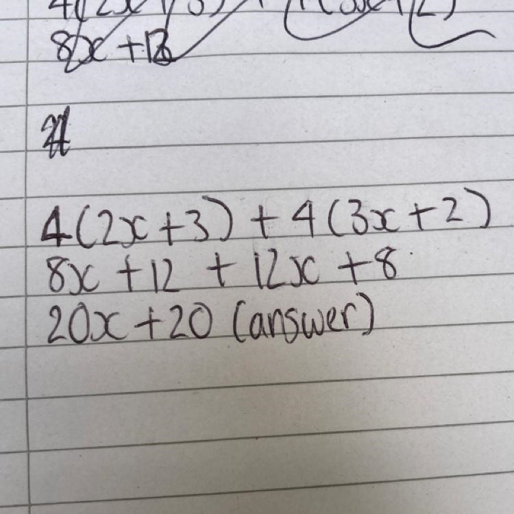first, you use the distributive property to find 8x+12 and 12x+8. Then you simplify them by adding to get 20x+20