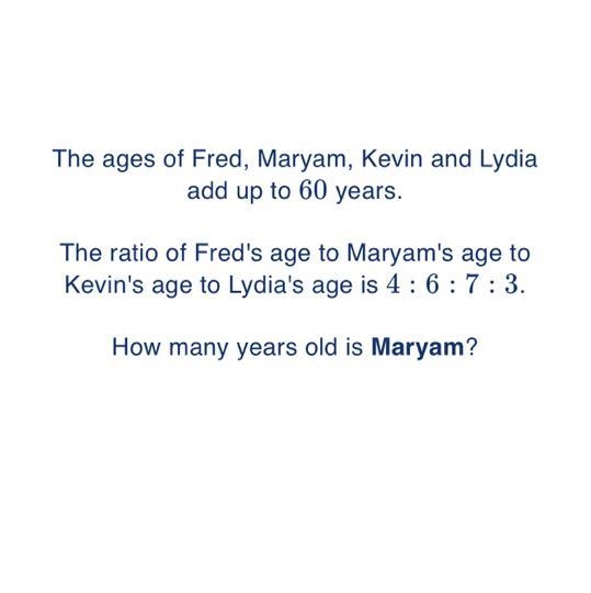 The ages of Fred, Maryam, Kevin and Lydia add up to 60 years. The ratio of Fred's-example-1