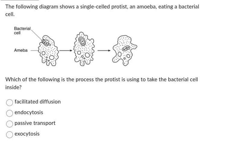 Which of the following is the process the protist is using to take the bacterial cell inside? facilitated diffusion endocytosis passive transport exocytosis