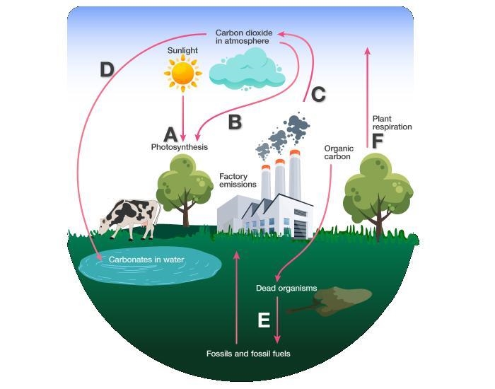 Which arrow or arrows represent a release of carbon dioxide? What process is occurring at the arrow(s) you selected?