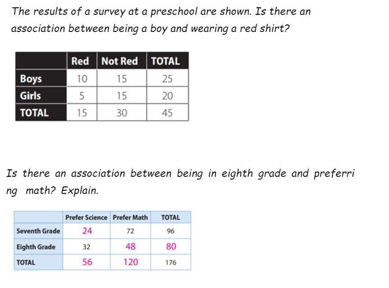 Since 40%>20%, we can say that boys are more likely to wear red shirts, or a positive association