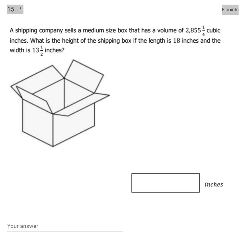 Volume is the length × width × height, or the area × height. We are given the length and width of the box, so we can find the area pretty easily, by multiplying 18 and 13.5 to get 243 inches.