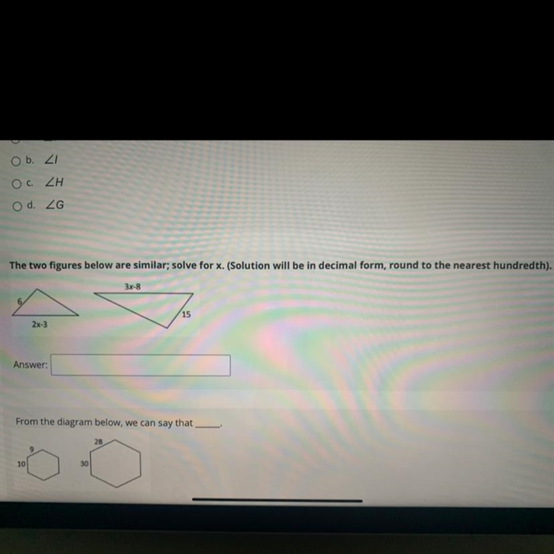 You want to solve for x when corresponding sides of the similar triangles have lengths 6 and 15, and (2x -3) and (3x -8).