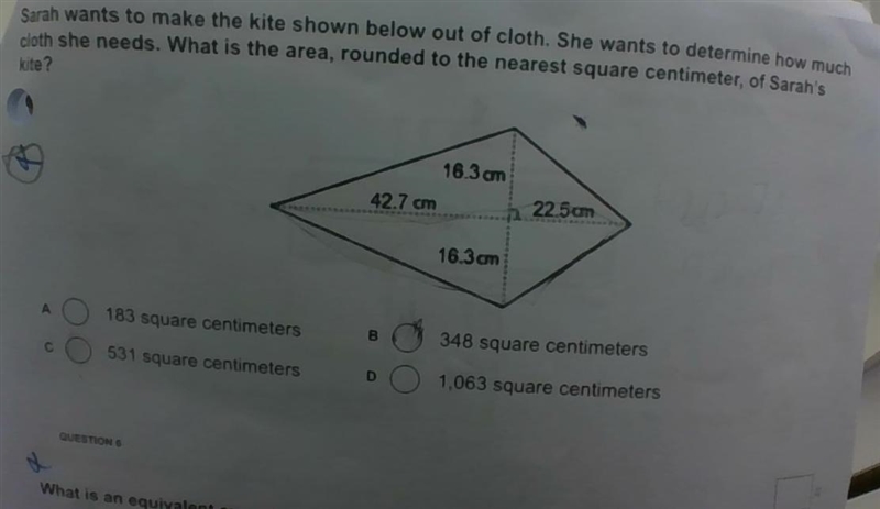 We will use the formula for a kite's area. The measurements we use are p = 16.3 cm + 16.3 cm and q = 42.7 cm + 22.5 cm.
