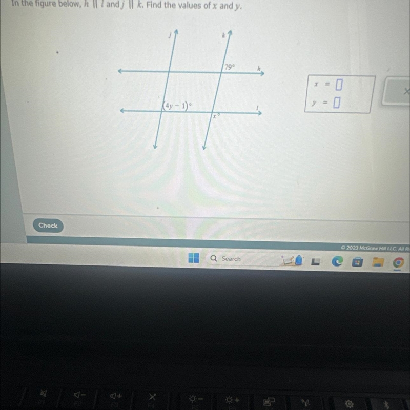 From corresponding angles, x is the supplement of ( 4y - 1 )