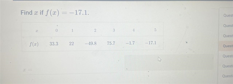 f(x) = -17.1 means that the number you inputted for x gave an output of -17.1. We see from the table that when x = 5, f(x) = -17.1.