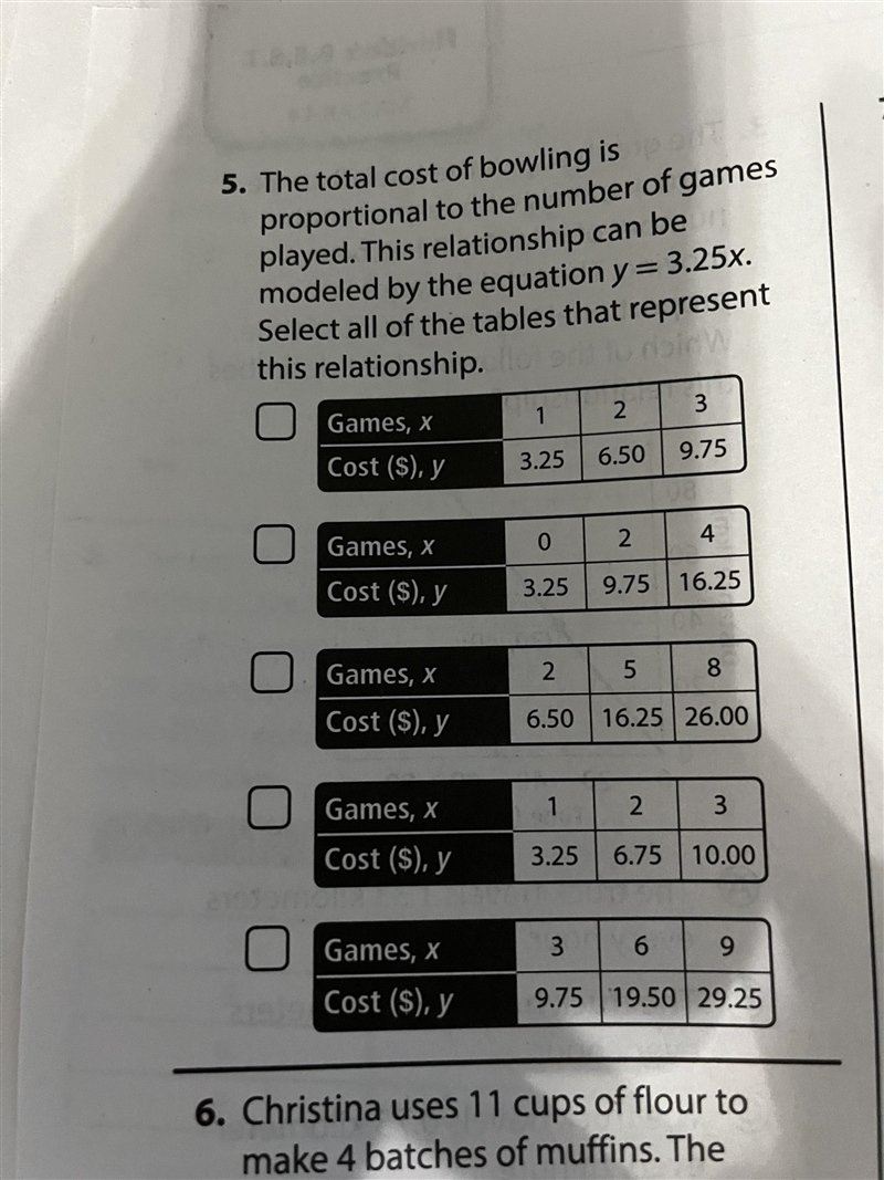 the total cost of bowling is proportional to the number of games played. this relationship can be modeled by the equation y = 3.25x. select all of the tables that represent this relationship