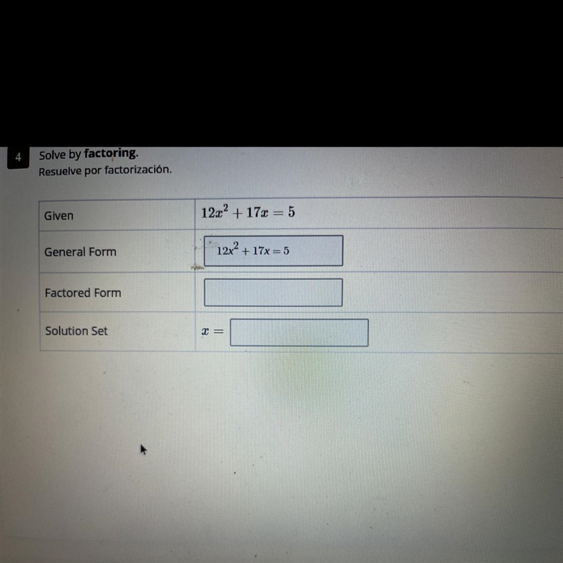 Subtract 5 to both sides and then get 12x^2+17x-5=0. Then rewrite the difference for 17x so 20x-3x. Your equation will look like this 12x^2+20x-3-5=0. Now factor 4x out of 12x² ad 20x and get 4x(3x+5). Now factor 3x+5 ad get (4x-1). Now set (3x+5)=0 and (4x-1)=0 and now you will get -5/3 and 1/4.