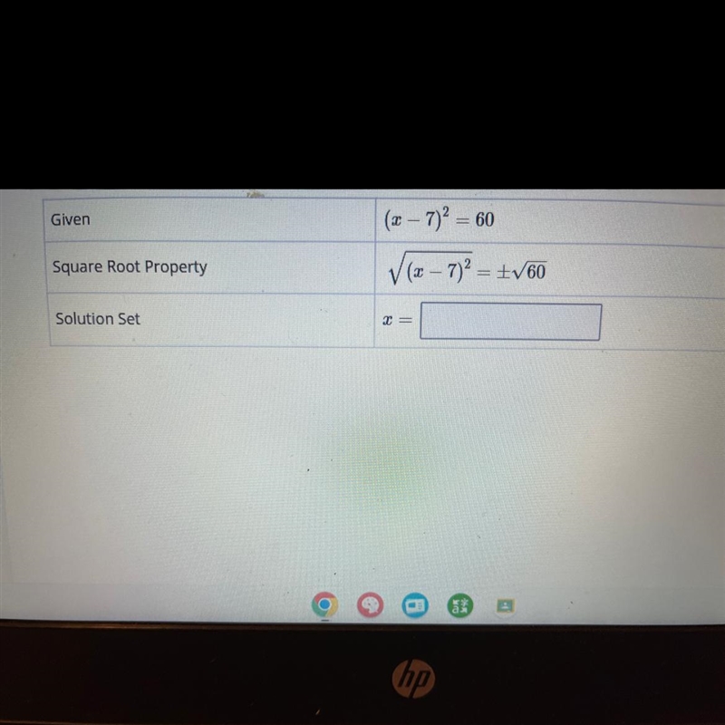 To solve the equation (x - 7)^(2) = 60, we can start by taking the square root of both sides: