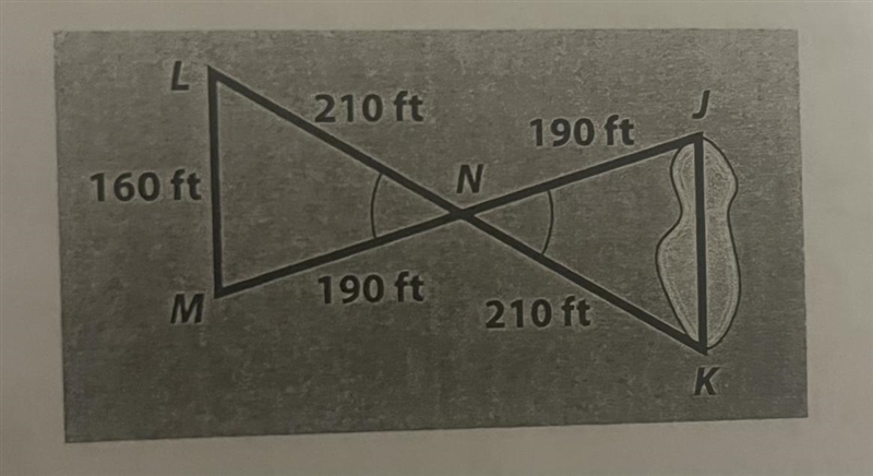 Answer: Ava incorrectly applied the SSS triangle Congruence Theorem. The SSS triangle Congruence Theorem states that if the three sides of one triangle are congruent to the three sides of another triangle, then the two triangles are congruent. In this case Ava is assuming that the two triangles formed by the line across the pond are congruent, and therefore, the distance JK must be 160 ft. However, the fact that the two triangles share a side does not necessarily mean they are congruent. Therefore, Avas conclusion that the distance is 160 ft is not necessarily true.