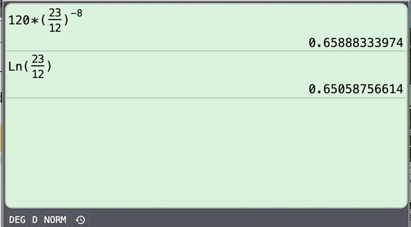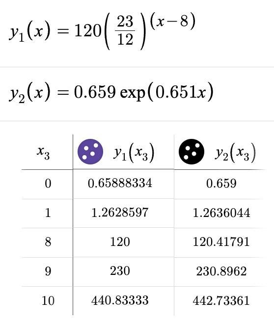 In this form, a = 120·(23/12)^(-8) ≈ 0.659, and k = ln(23/12) ≈ 0.651, so the equation could be ...