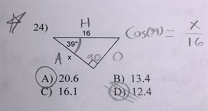 The leg length (x) cannot be greater than the hypotenuse (16), so choices A and C can be eliminated immediately. Answer choice B corresponds to an angle of 33.1°, which is nowhere to be found in this figure.