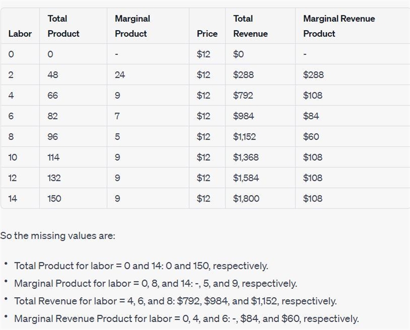Answer: To fill in the missing values, we can use the formulas for marginal product and marginal revenue product: