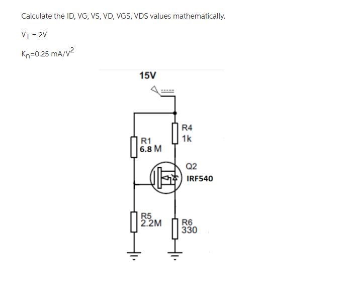 Calculate the ID, VG, VS, VD, VGS, VDS values mathematically.