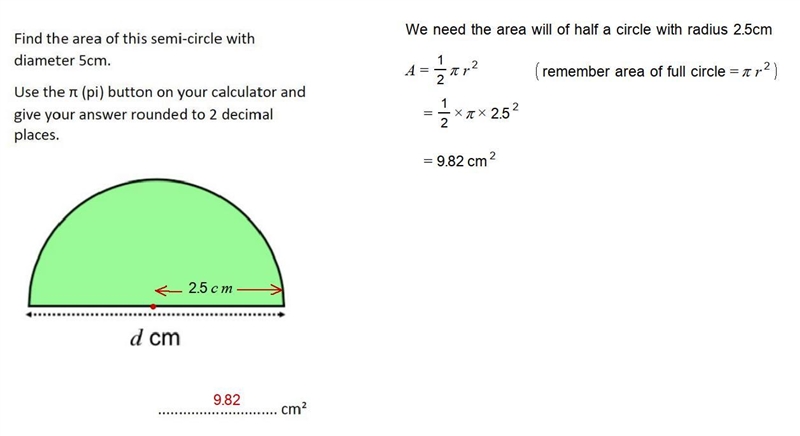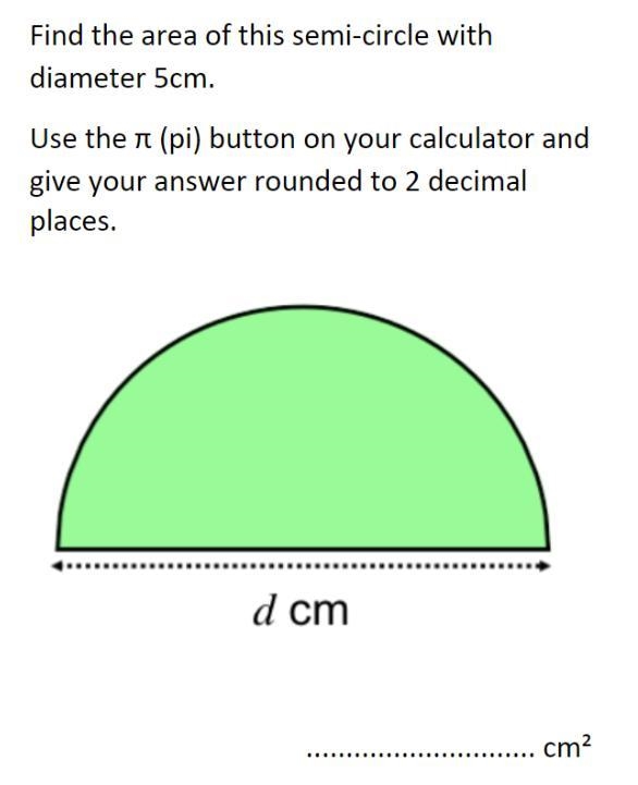 Find the area of this semi-circle with diameter 5cm. Use the л (pi) button on your calculator and give your answer rounded to 2 decimal places. No spam, please.