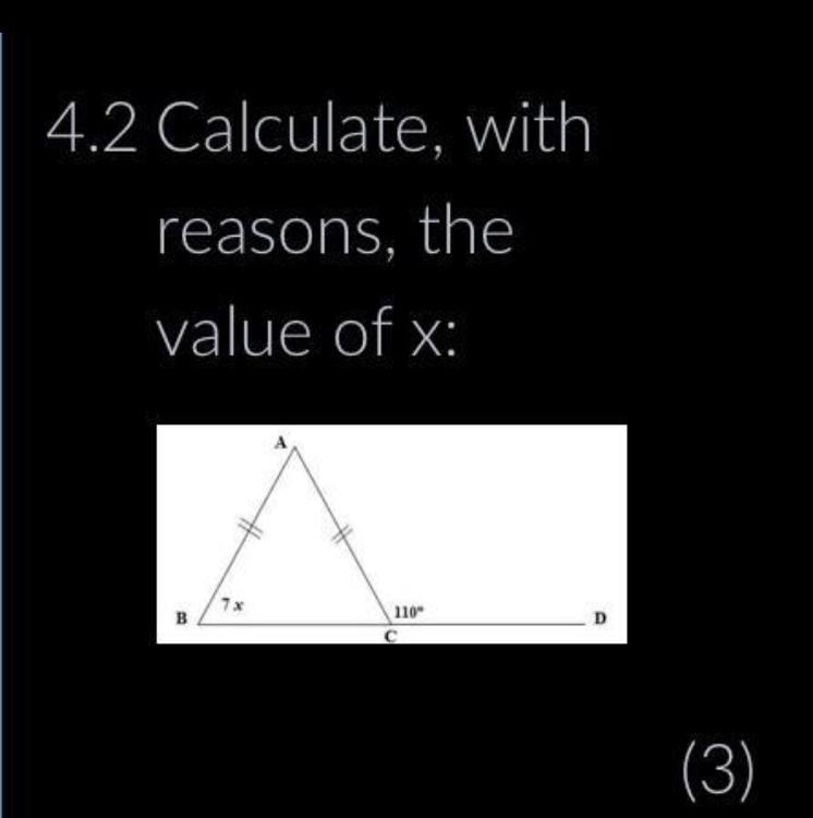 Due to isosceles triangle , ∠ABC = ∠ACB = 7x ∠ACB + ∠ACD = 180 ( Linear pair I think )7x + 110 = 1807x = 70