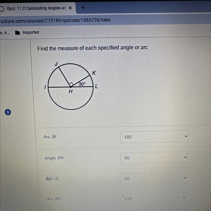Find the measure of each specified angle or arc Arc JK Angle JHI Arc IJL Arc JKL H 30° K L 180 90 60 120