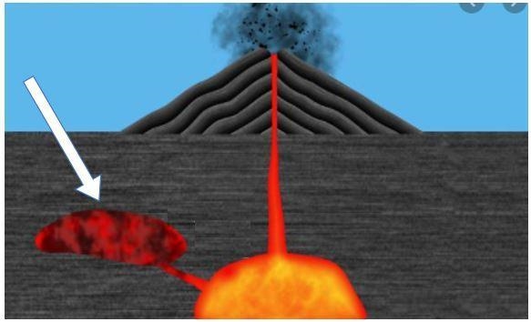 Which type of rock would be formed at the location indicated in this image? A. intrusive-example-1