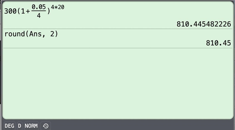 A = $300(1 +0.05/4)^(4·20) ≈ $810.45