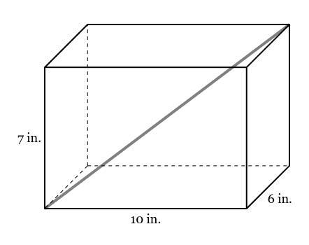 A straw is placed inside a rectangular box that is 10 inches by 6 inches by 7 inches, as shown. If the straw fits exactly into the box diagonally from the bottom left corner to the top right back corner, how long is the straw? Leave your answer in simplest radical form.
