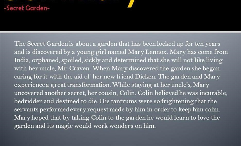 The novel begins by introducing the reader to Mary — although it would perhaps be more accurate to say it begins by introducing us to her faults. She is described as ugly, ill-tempered, and viciously demanding; in short, she is "as tyrannical and selfish a little pig as ever lived." At the same time, however, the reader is given to understand that the source of Mary's hatefulness is not precisely in her: the blame lies with her parents—particularly her mother. Disappointed by her daughter's ugliness and sickliness, Mary's mother cruelly refuses to see her, instead leaving her in the care of a retinue of Indian servants who care nothing at all for the child. The servants must, however, obey her every whim, in this can be found the source of her imperiousness. Mary's only pleasure, even at this early point in the novel, is play-gardening: she sits beneath a tree and idly places cut flowers in mounds of sound. After the death of her parents in the cholera epidemic, she engages in the same activity at the house of the clergyman and his family. Throughout the first part of the novel, Mary remains standoffish and rude; however, the omniscient narrator consistently makes it clear that Mary is only so awful because of the wretched circumstances of her early childhood. The reader has access to the loneliness and displacement that Mary herself is not able to express, but feels deeply. The instant her circumstances improve—that is, the instant that she arrives at Misselthwaite—Mary too begins to improve. She becomes active and interested in the world around her (in India, she was always "too hot and languid to care about anything.") The reader thereby recognizes that there is nothing innately cruel about Mistress Mary: she is a victim of her own isolation. Mary develops real affection for her maidservant, Martha Sowerby, and for the robin redbreast that lives in the secret garden. She falls thoroughly in love with Dickon, and befriends Colin and Ben Weatherstaff; in short, she becomes utterly engrossed in the world around her. The English landscape and her work in the secret garden have a miraculously restorative effect upon her: by novel's end, Mary is no longer bitter and friendless, but is instead an ordinary playful ten-year-old girl surrounded by her intimates.