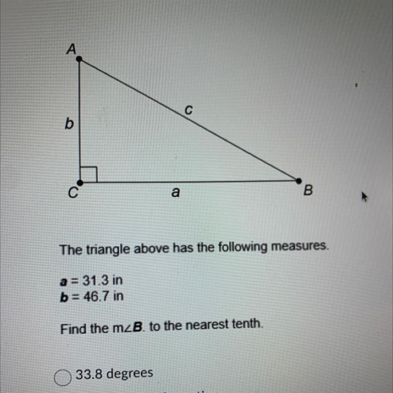 In this case, with the information we have, we would use tangent since we have both the opposite side, b, and the adjacent side, a.