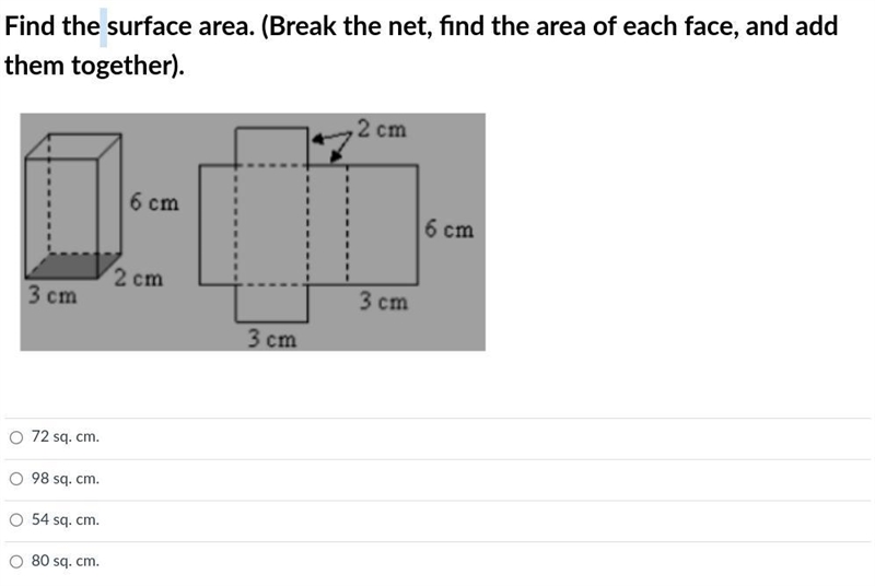 Now to find the total surface area, we need to add the gathered surface area from each shape, 12+36+24=72