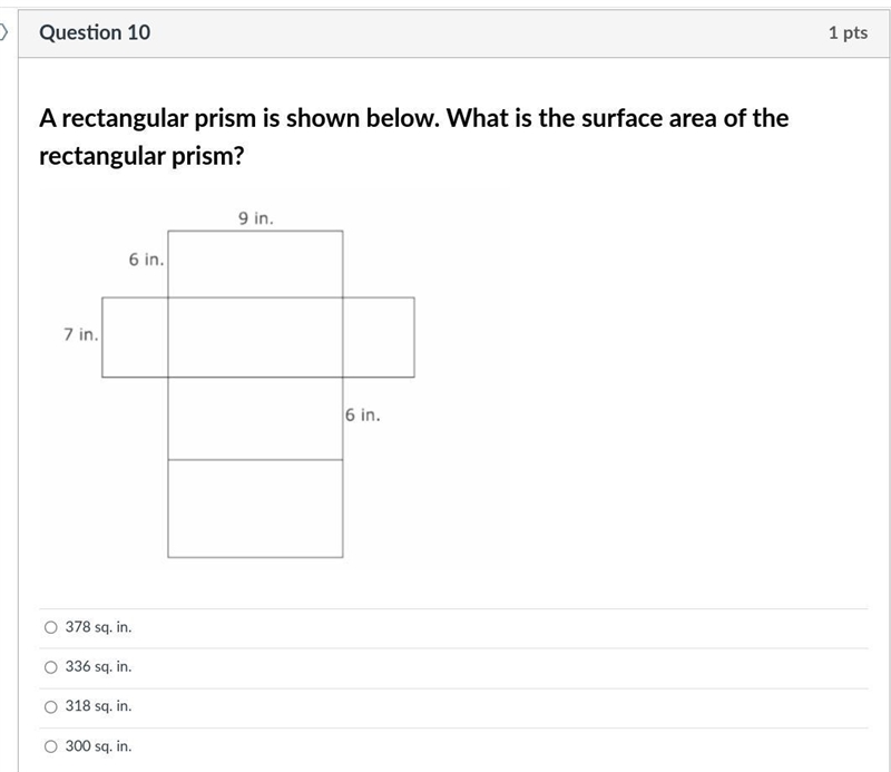 Surface Area = 42 in² + 42 in² + 54 in² + 54 in² + 54 in² + 54 in²