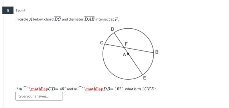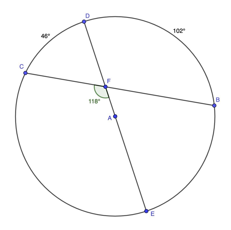 You want the measure of angle CFE given arcs CD = 46° and DB = 102°, where DE is a diameter of circle A.