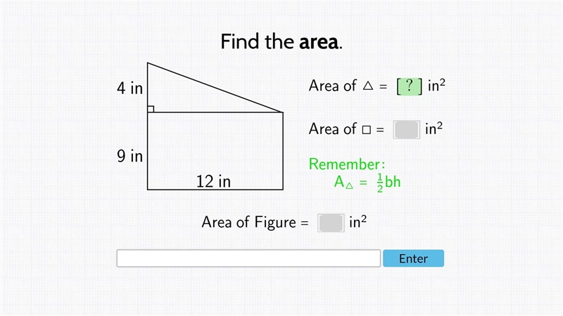 A_(\triangle)=(1)/(2)\cdot 12\text{ in}\cdot 4\text{ in}=24\text{ in}^2\\\\A_(\square)=12\text{ in}\cdot 9\text{ in}=108\text{ in}^2\\\\A_{\text{Figure}}=A_(\triangle)+A_(\square)=24\text{ in}^2+108\text{ in}^2=132\text{ in}^2