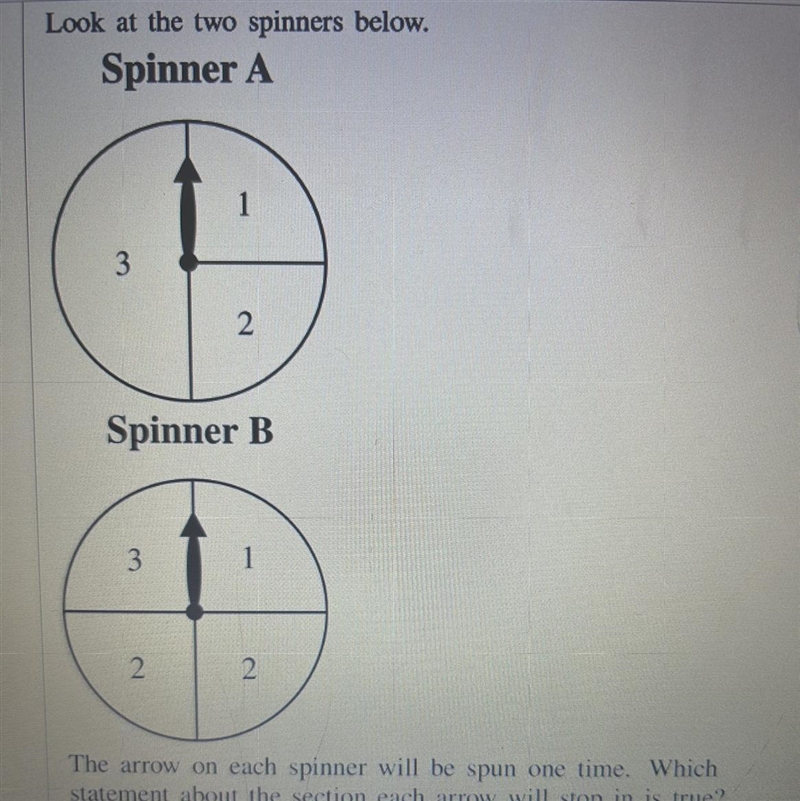 The arrow on each spinner will be spun one time. Which statement about the section each arrow will stop in is true?