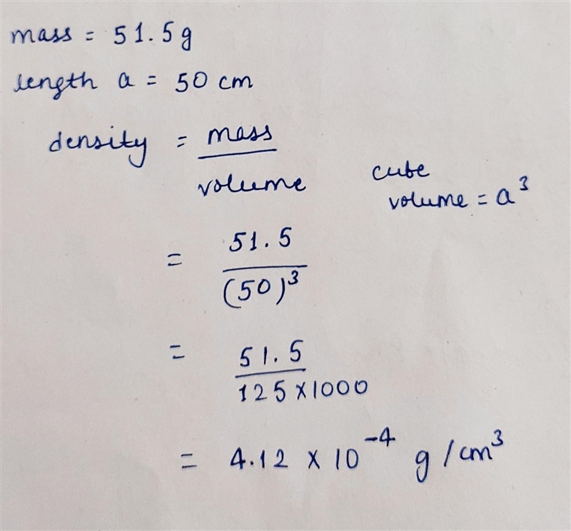The mass of 50 cm cube milk is 51.5 g find the density of milk in gcm cube