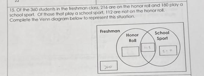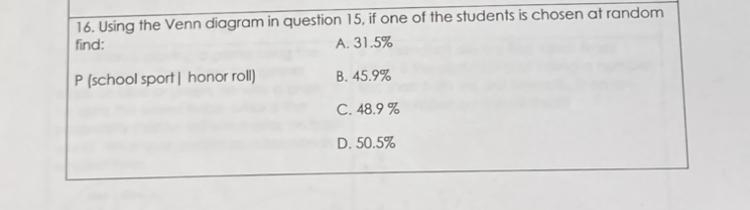 16. P(school sport | honor roll) = probability a student is on a school sport GIVEN that they are on the honor roll = P(A and B)/P(B) = 68/148 = 45.9%