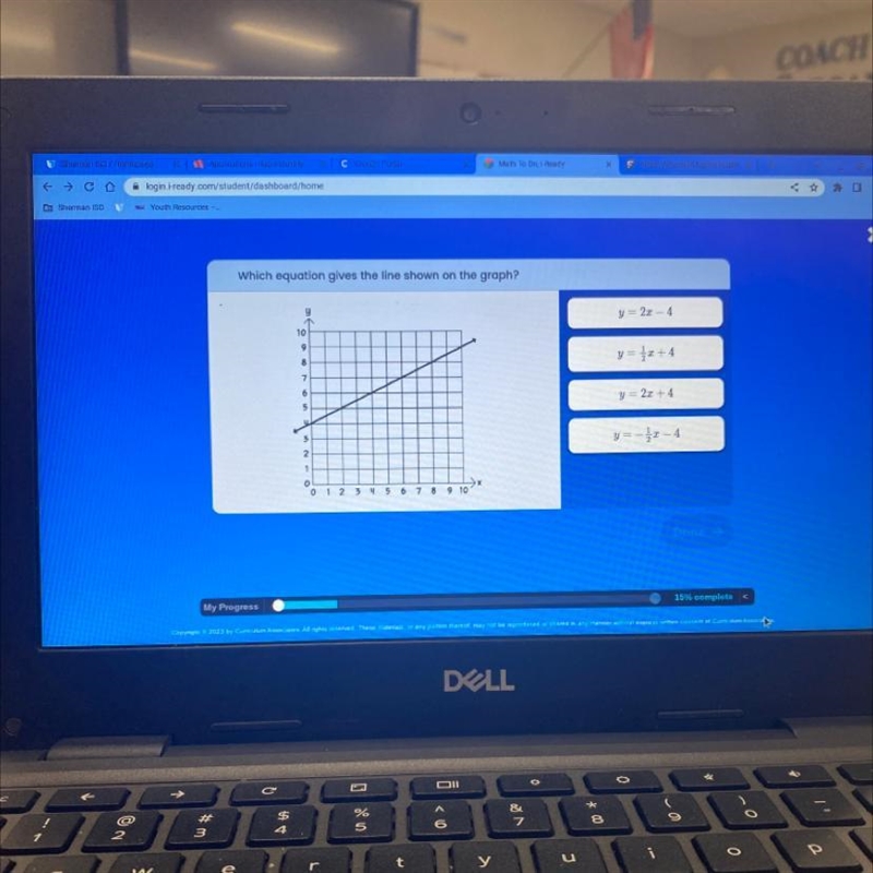Answer: To determine which equation gives the line shown on the graph, we need to examine the slope (m) and y-intercept (b) of the line.
