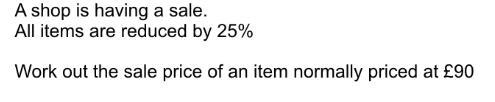 You multiply the normal price by 25% or .25 then subtract that from the original price. So 90 pounds times .25 makes 22.50 pounds off of 90. 90-22.50 = 67.50 pounds