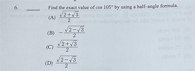 First, split the angle into two angles where the values of the six trigonometric functions are known. In this case, 105, can be split into 45+60 (cos (45+60))
