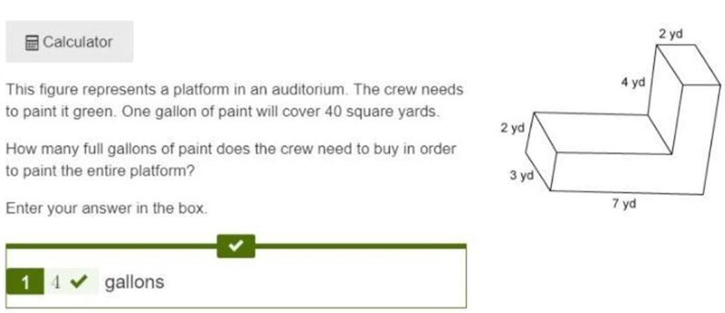 This figure represents a platform in an auditorium. The crew needs to paint it green. One gallon of paint will cover 40 square yards. How many full gallons of paint does the cre…
