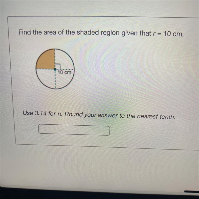 Find the area of the shaded region given that r = 10 cm. 10 cm Use 3.14 for T. Round your answer to the nearest tenth.