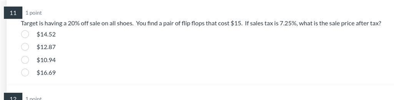 Discount amount = 20% of $15 = 0.20 * $15Discounted price = $15 - (0.20 * $15)Calculate the sale price after tax: