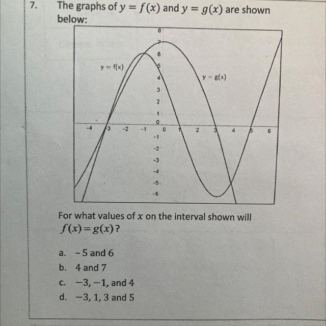 The graphs of y=f(x) and g(x) are shown below: a: -5 and 6 b: 4 and 7 c: -3,-1, and 4 d: -3,1,3 and 5