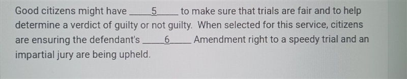 Good citizens might have _____to make sure that trials are fair and to help determine a verdict of guilty or not guilty. When selected for this service, citizens are ensuring the defendant's Amendment right to a speedy trial and an _____impartial jury are being upheld.