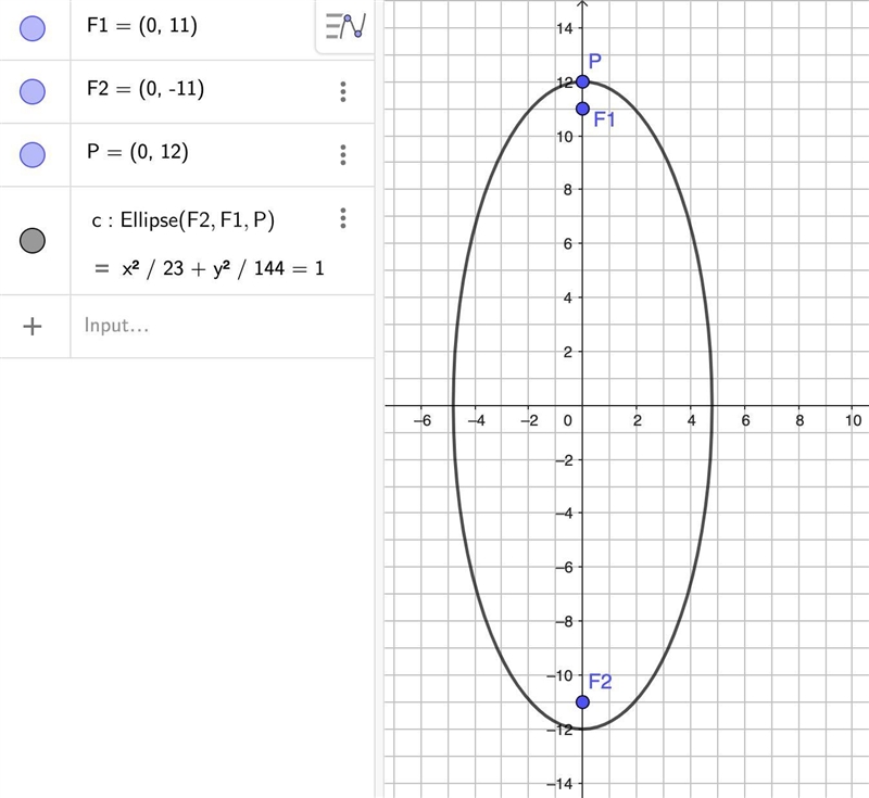 You want an equation of the ellipse with foci at (0, ±11) and a vertex at (0, 12).