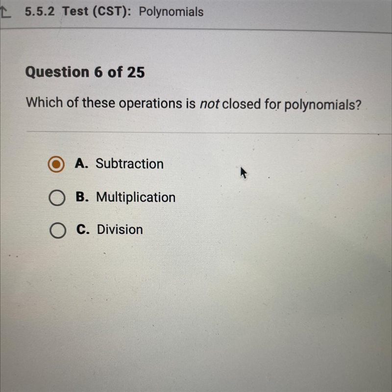 Which of these operations is not closed for polynomials? -A. Subtraction -B. Multiplication -C. Division