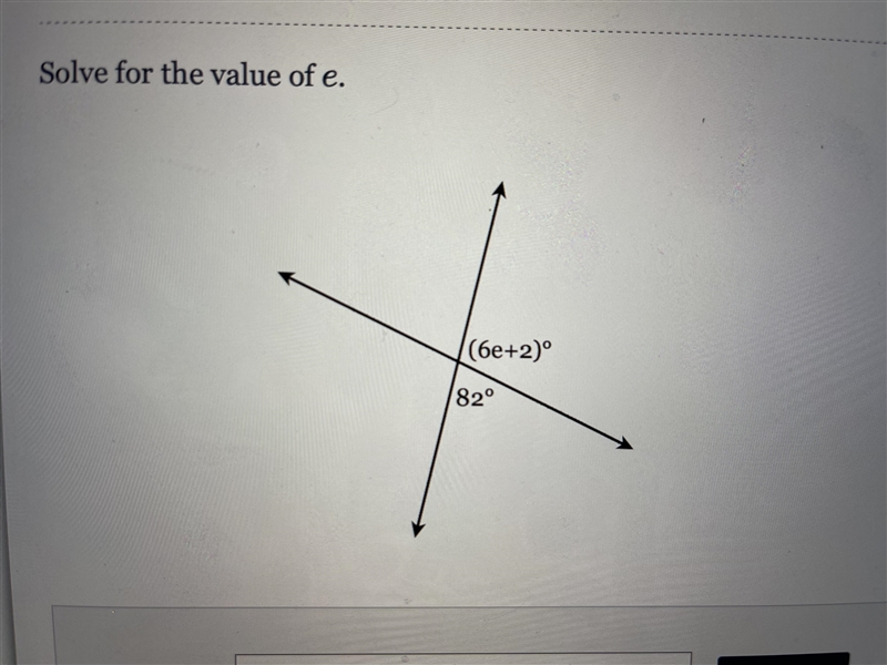 e = 16, because both angles added together are equal to 180* and 180*-82*=98*, now we know that the angle including e is 98* meaning 98*-2=96 and 96*-:- 6=16