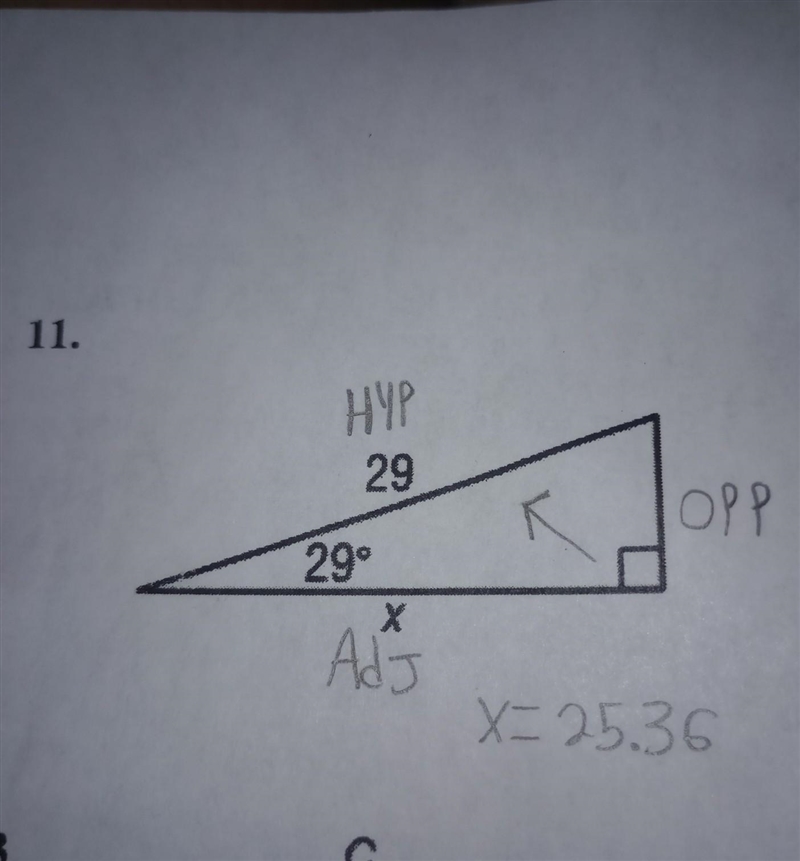 Solve for x: Given: Acute Angle=29° Hypotenuse=29 Adjacent - x=?Relation: cosinecos29°=\frac{x}{29}\frac{cos29°}{1}=\frac{x}{29}29(cos29°)=x25.36=x
